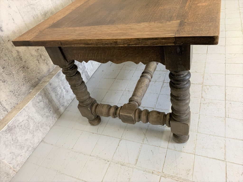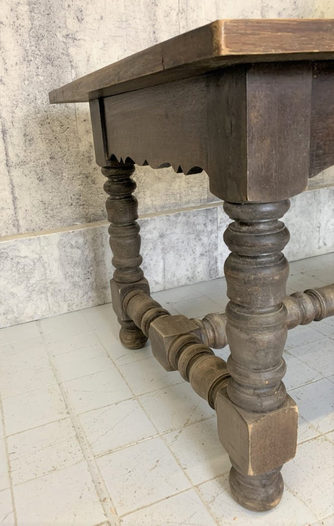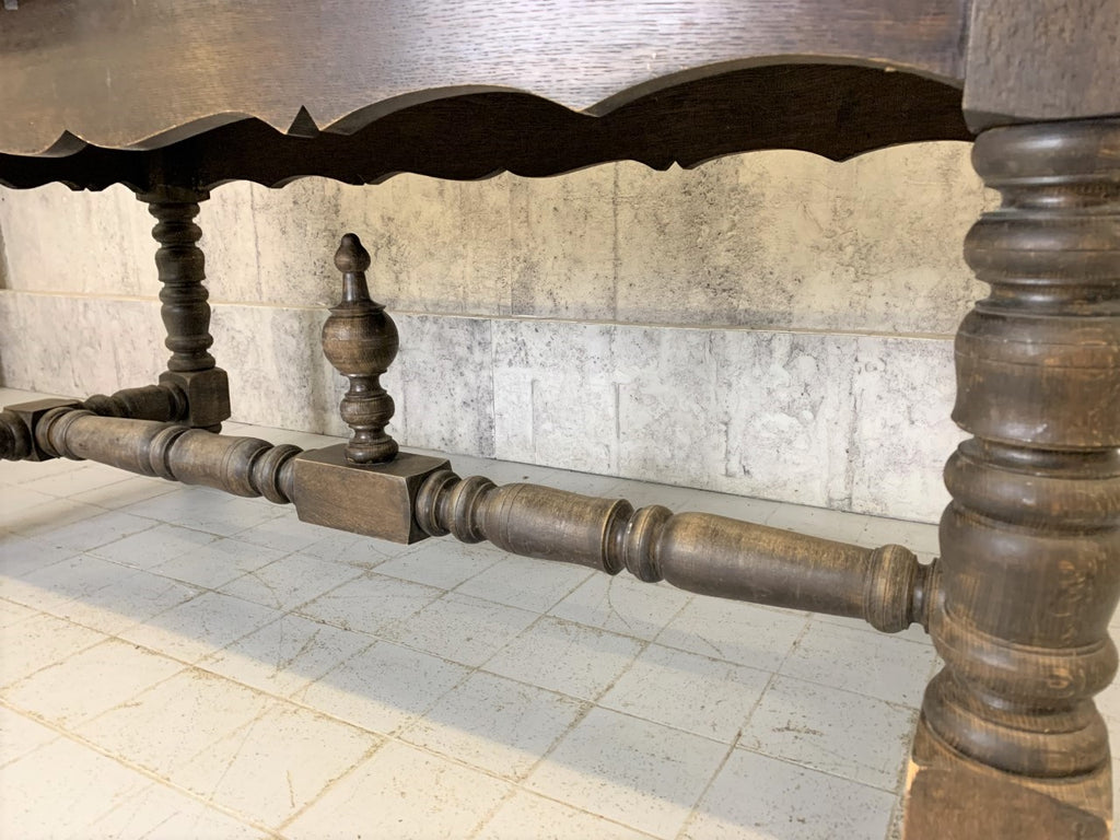 Solid oak.. sturdy, solidly constructed with this beautiful detailing to the 'skirt' and the legs. I have never seen a table like this before. The table has ideal dimensions to be used as a dining table or it would be suitable too to be used as a decorative console table or kitchen work table. It would certainly make a statement. We have check that adult legs will fit underneath the skirt and they do. Marry with modern, metal or upholstered chairs.. actually any type matches this simply stunning table. This table has the most beautiful patina. A fabulous table, ready to use.