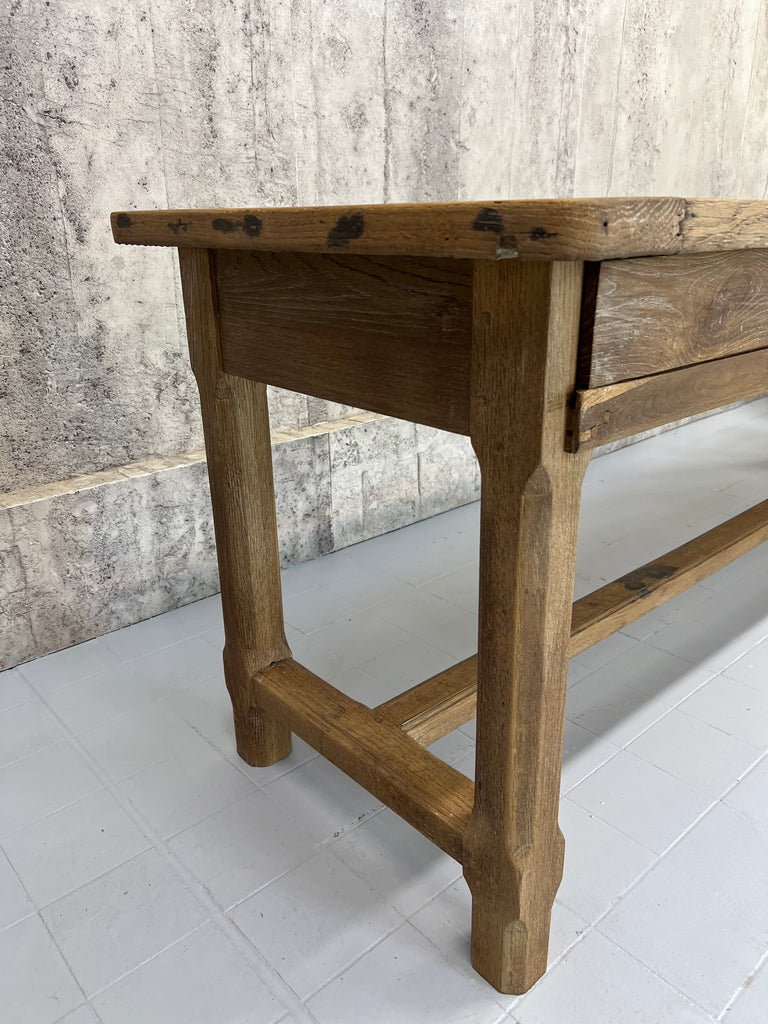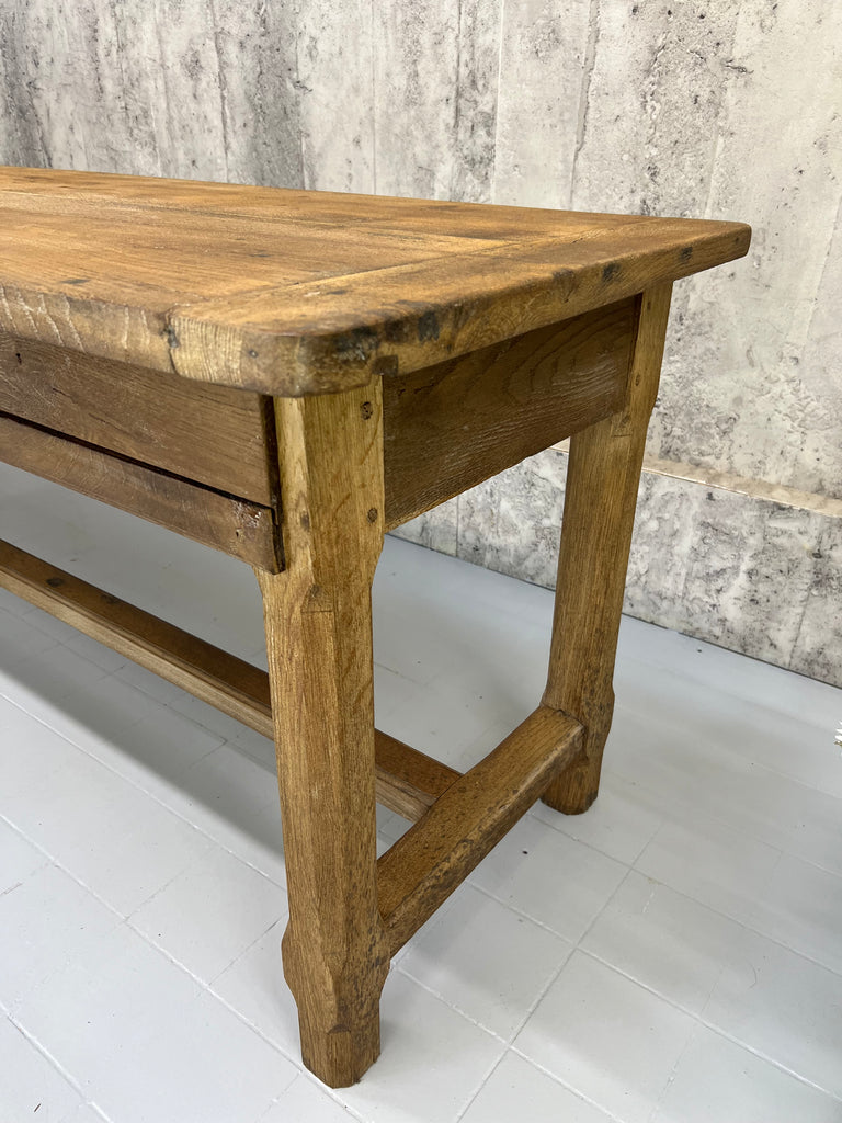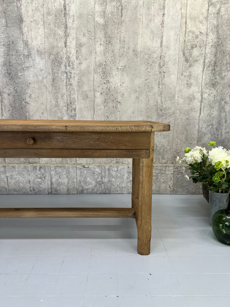 A narrow table, perfectly suited to a narrow dining space or as a serving table.  The table can seat upto 10, perhaps a few more if you use benches and you have small people to seat.  Made from heavy solid oak, with simple straight legs.  Beautiful table, ready to use as it is.