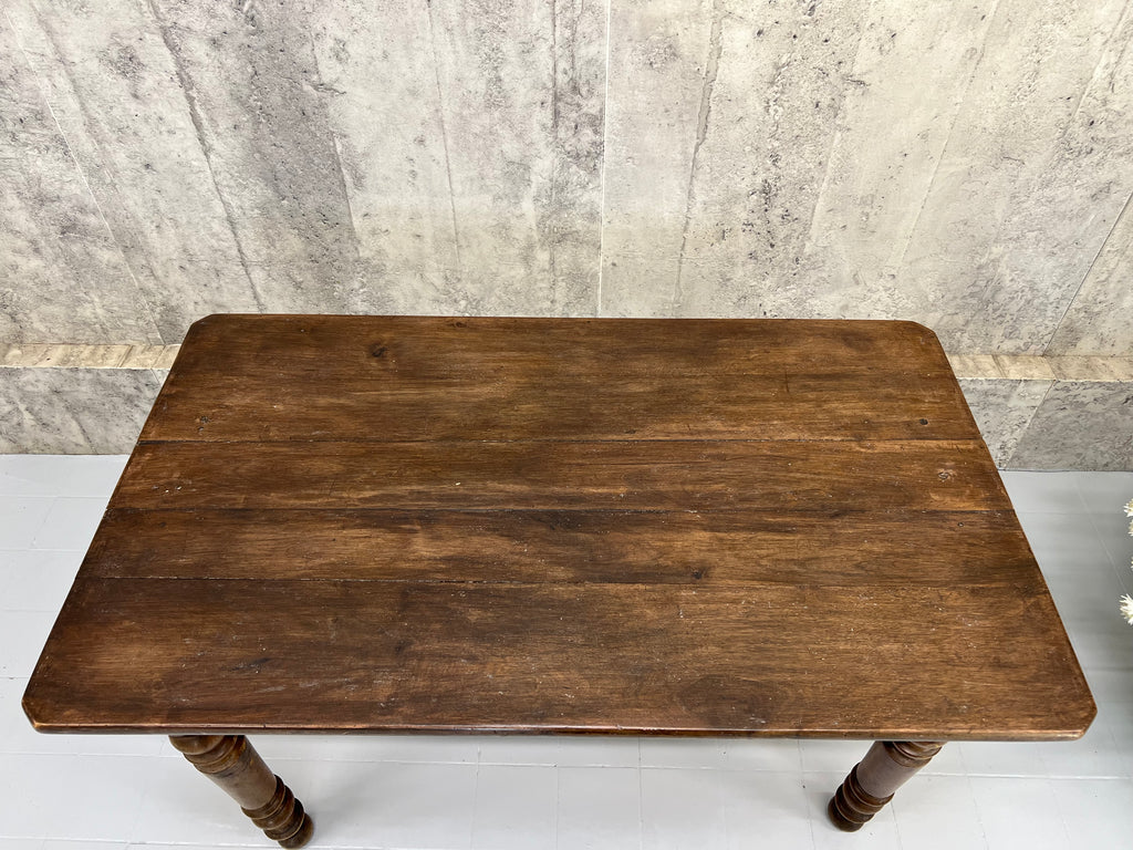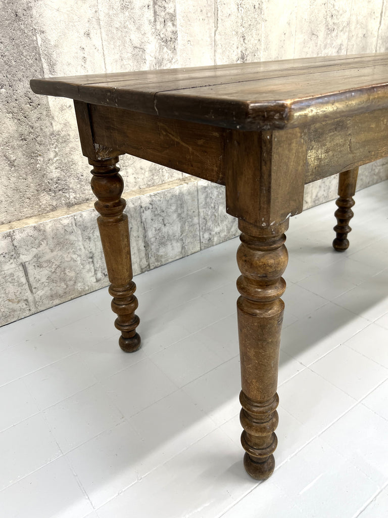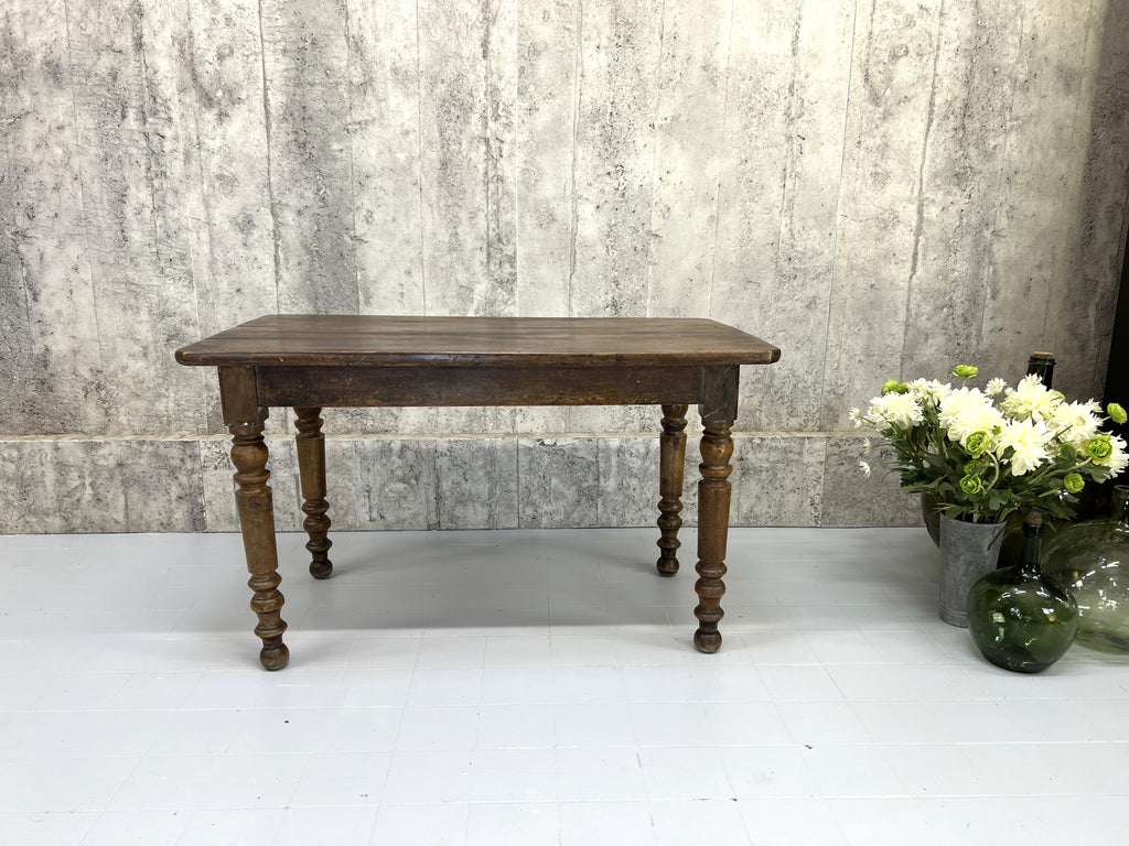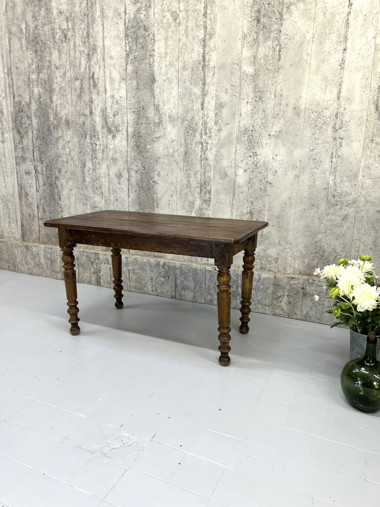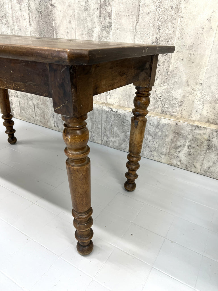 A classic and traditional French Bistro table made from solid walnut wood with beautiful wooden turned legs. In excellent ready to use condition for a bistro, bar or restaurant.. or even for a work space as a desk, with evidence of a previous paint treatment to the top of the table you can see flecks of white.. but not to ruin the overall look and these will wear off with use and time. Can seat 4 comfortably.