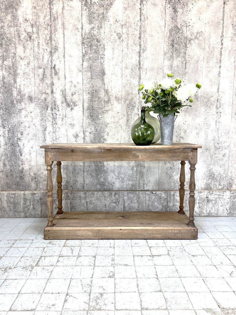 This fabulous console table made in the style of a classic Drapers Table which was used in a fabric shop to lay out the fabric ahead of measuring and cutting and the bolts of cloth were stored on the shelf underneath.