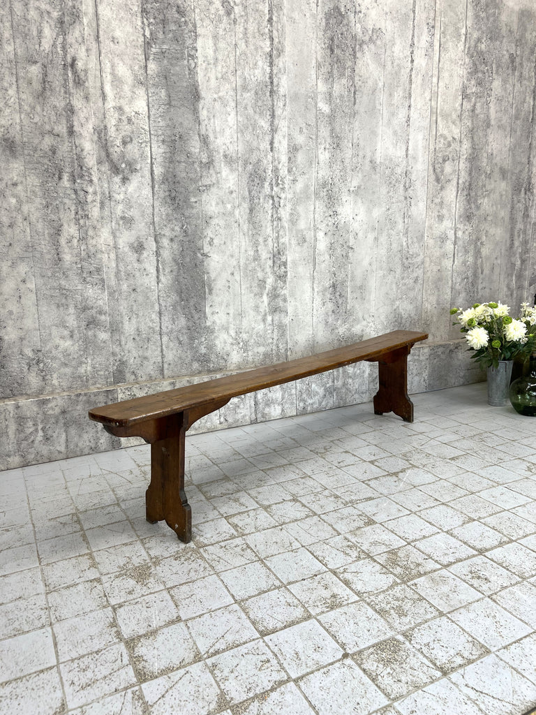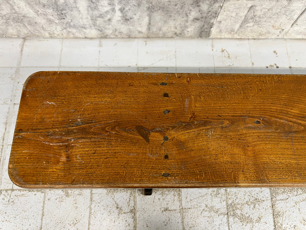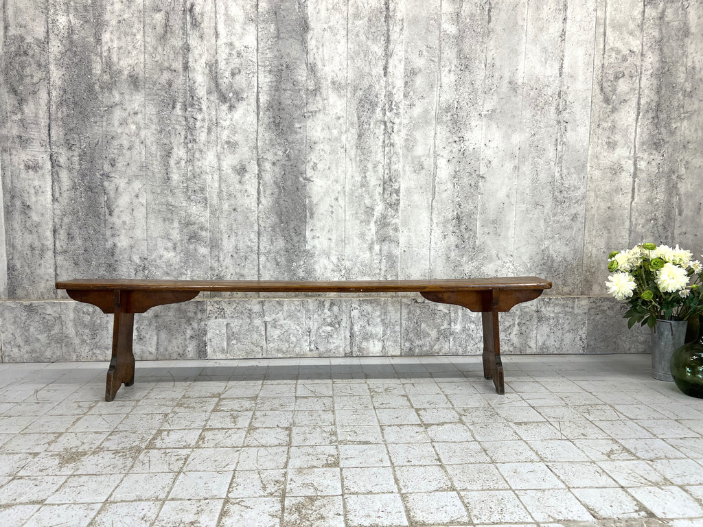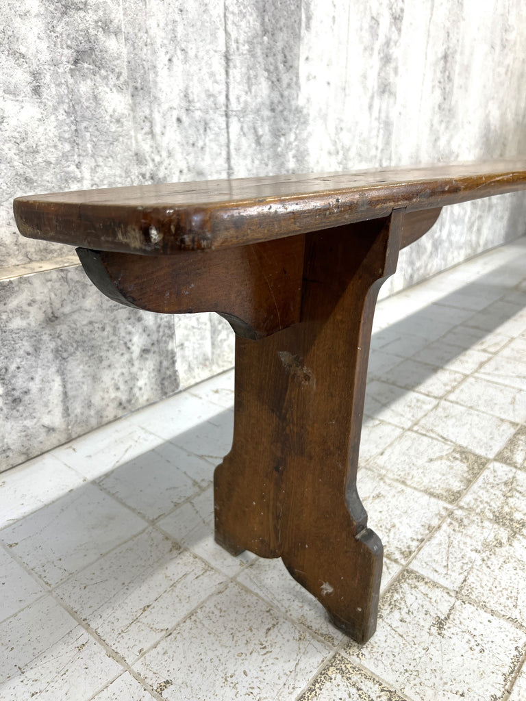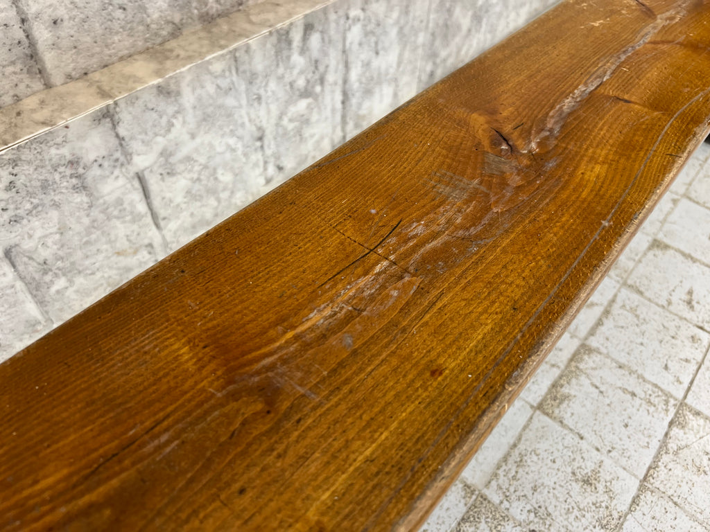 This bench is so versatile. Made from solid wood with fun construction details, in good condition for its use and age. Perfect as a dining room bench (the kids love sitting on benches to eat!) , outside for alfresco dining, also in a hallway for taking boots on and off, this can be used as a sort of coffee table/bench in a sitting area, or we also use these to dress the end of beds. A characterful, rustic and practical piece, currently finish with this varnish that is chipped off in places. A great seat. Ready to use.