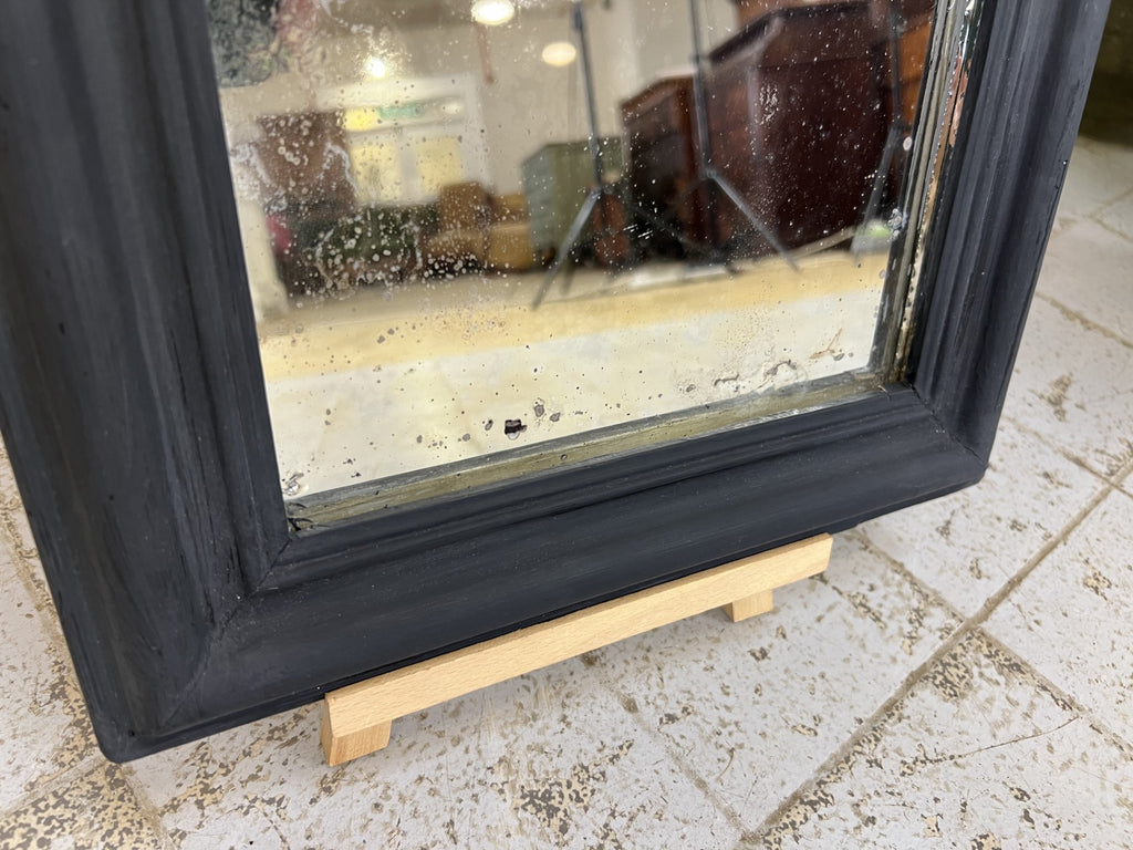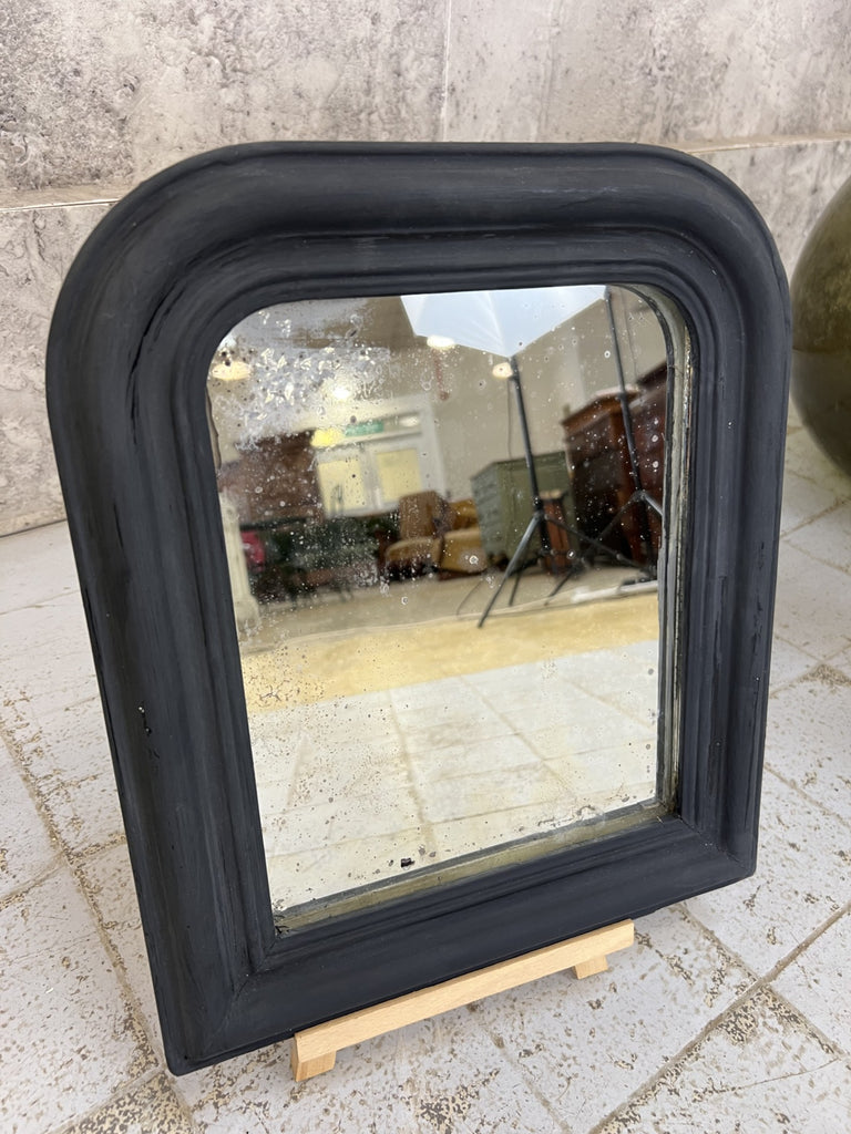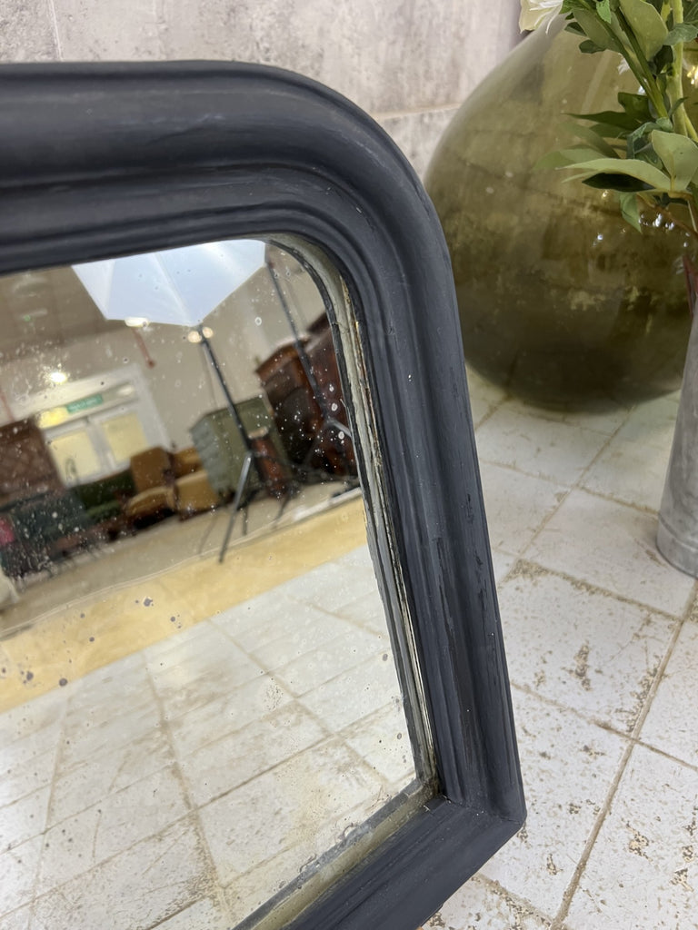 My hands down favourite place for these small Louis Philippe mirrors is in a modern bathroom.. also perfect for a hallway, dressing table, a very versatile mirror.. This example has the original mirror, with foxing.. please see the photographs for more details.. it is charming and characterful.. the foxing doesn't stop this being a wonderful decorative piece to bounce light around a room. The frame has been painted many times in the past, this latest version a matt black.