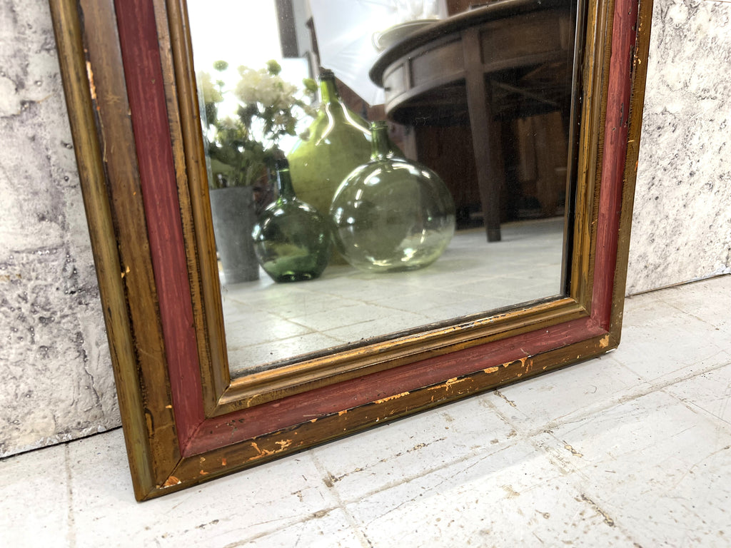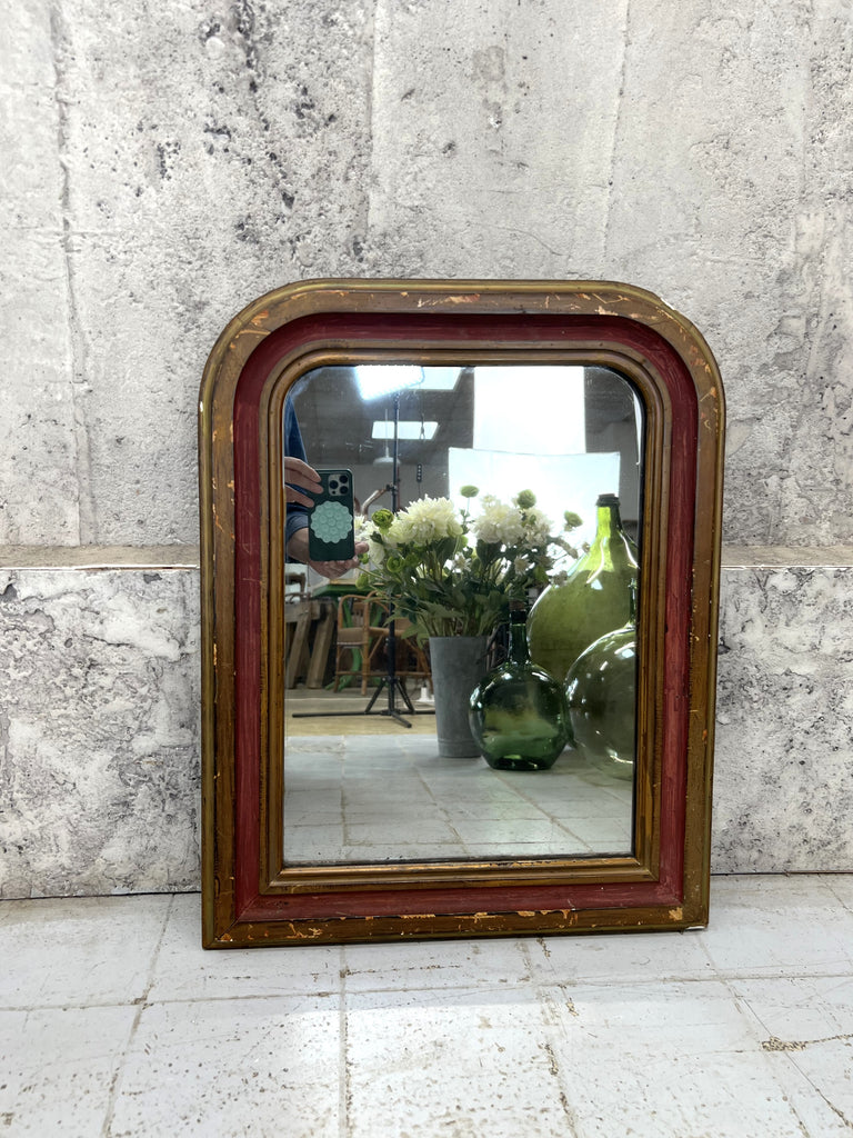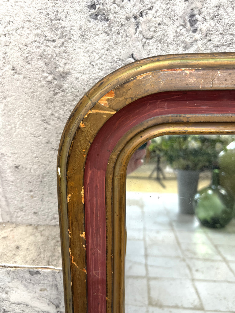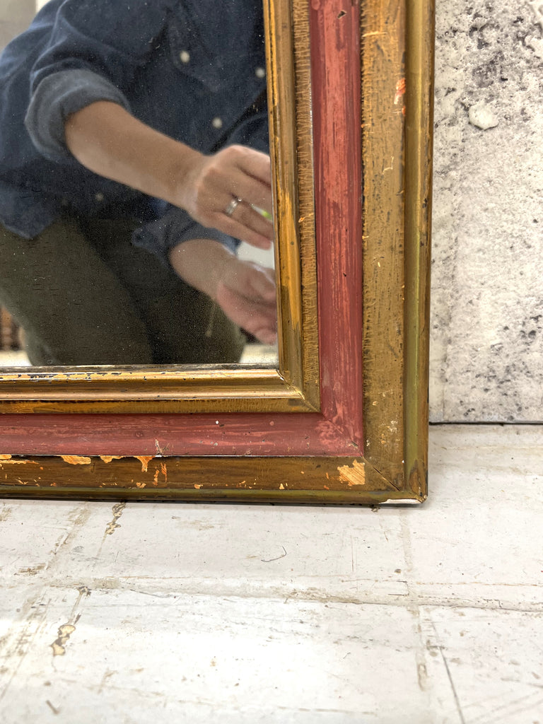 A shabby bashed up mercury mirror in the Louis Philippe shaped frame, which has been painted in a red and gold colour.. over the top of the original gilding.  Not for one who wants perfect.  A versatile mirror for any room.