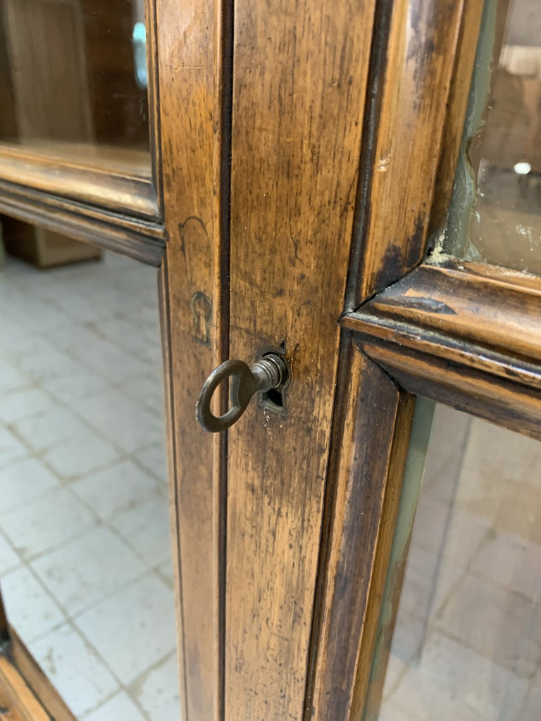 A fabulous solid walnut wood display cabinet with glass doors as once the top section of a dresser.