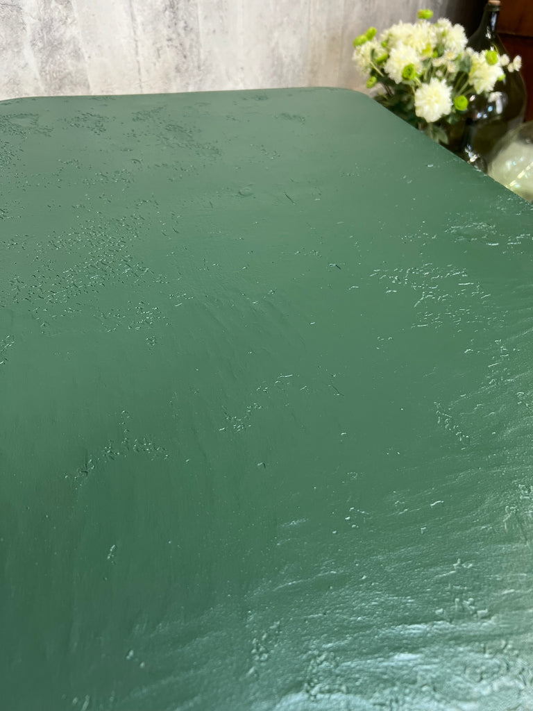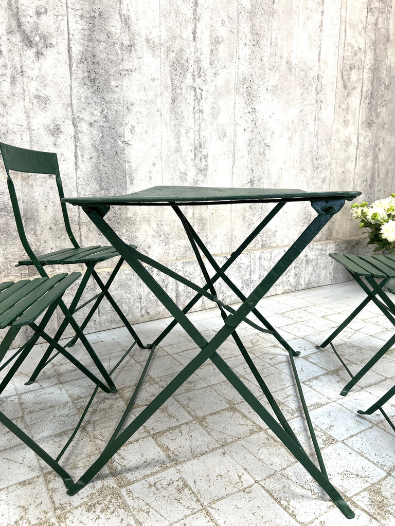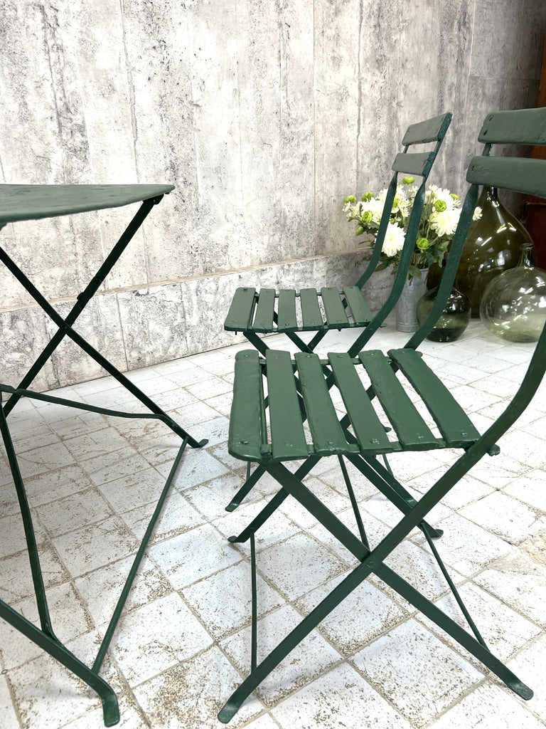 A fabulous, unique and characterful set of garden furniture. A set created from a complimentary set of metal and wooden folding bistro chairs, not matching, a metal folding table that is tied together into a set by this fabulous green paint. In good condition and ready to use. There have been layers of paint to the chairs and the table top is marked and warped as you can see from the photos, but all in good ready to use working condition. Perfect for use on a terrace, balcony or in a garden. Please don't buy this if you want perfect. This is for those that appreciate character over perfection.