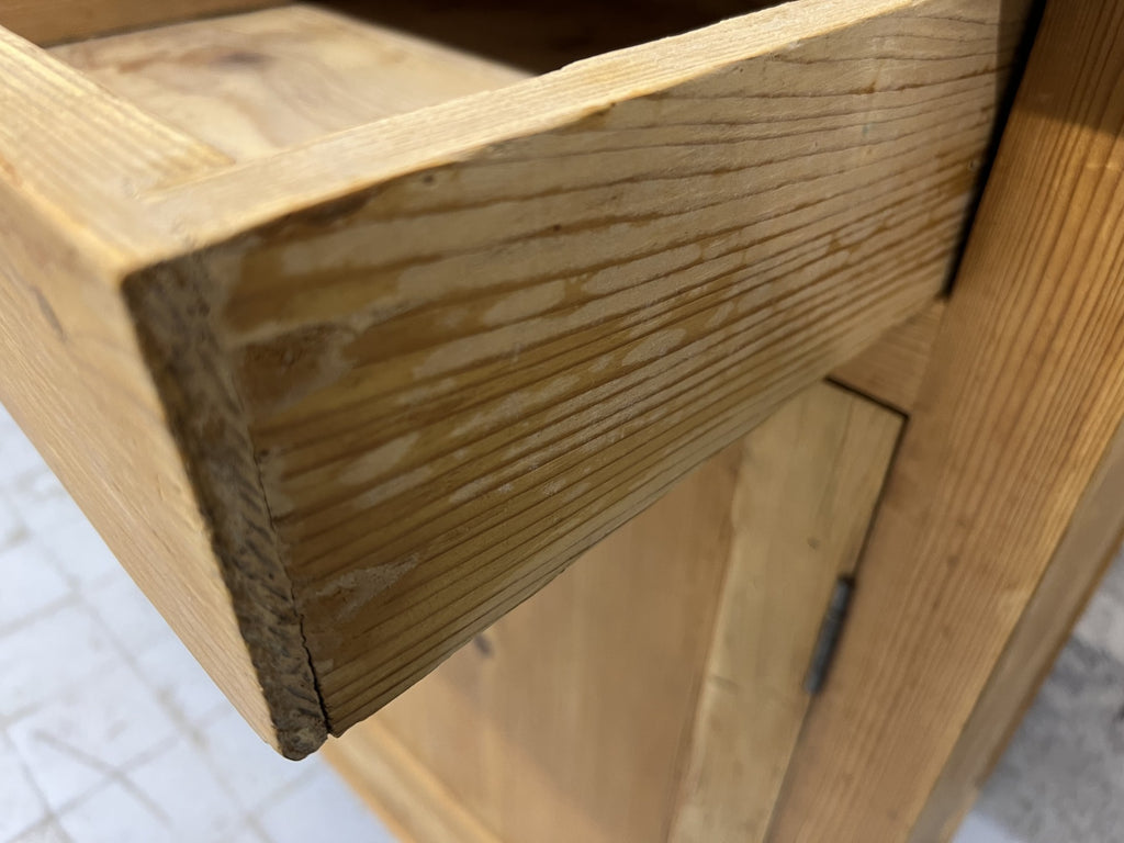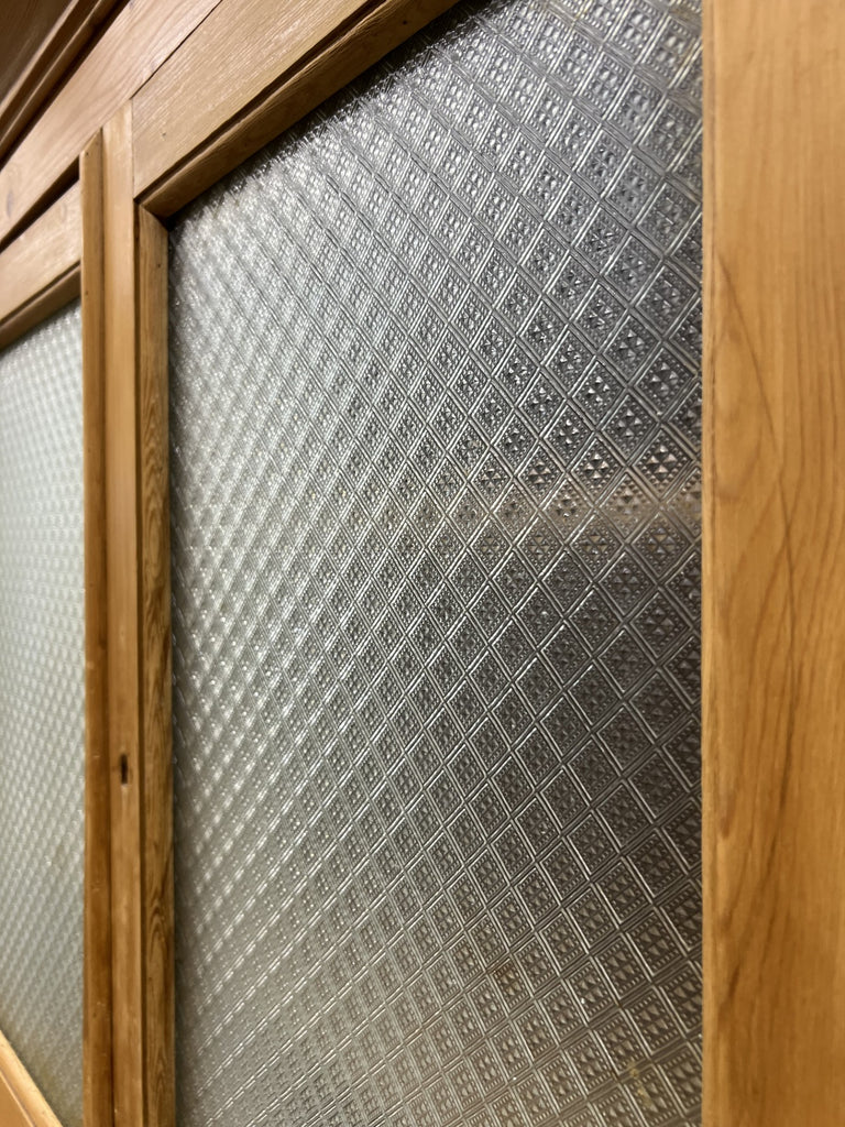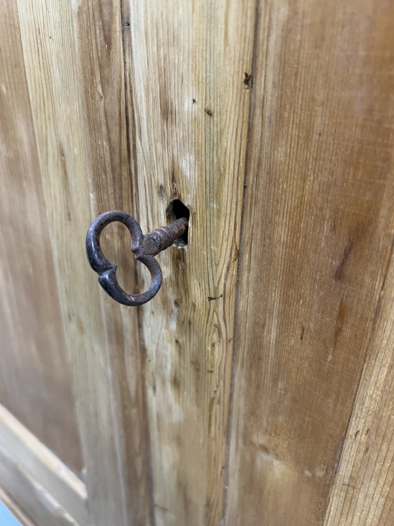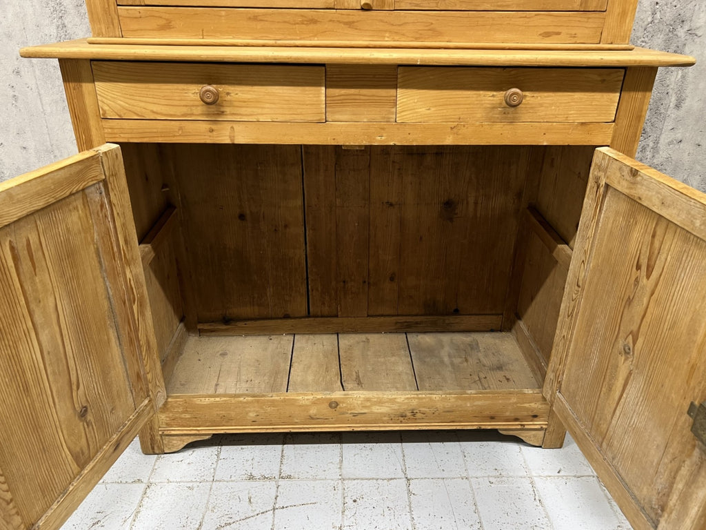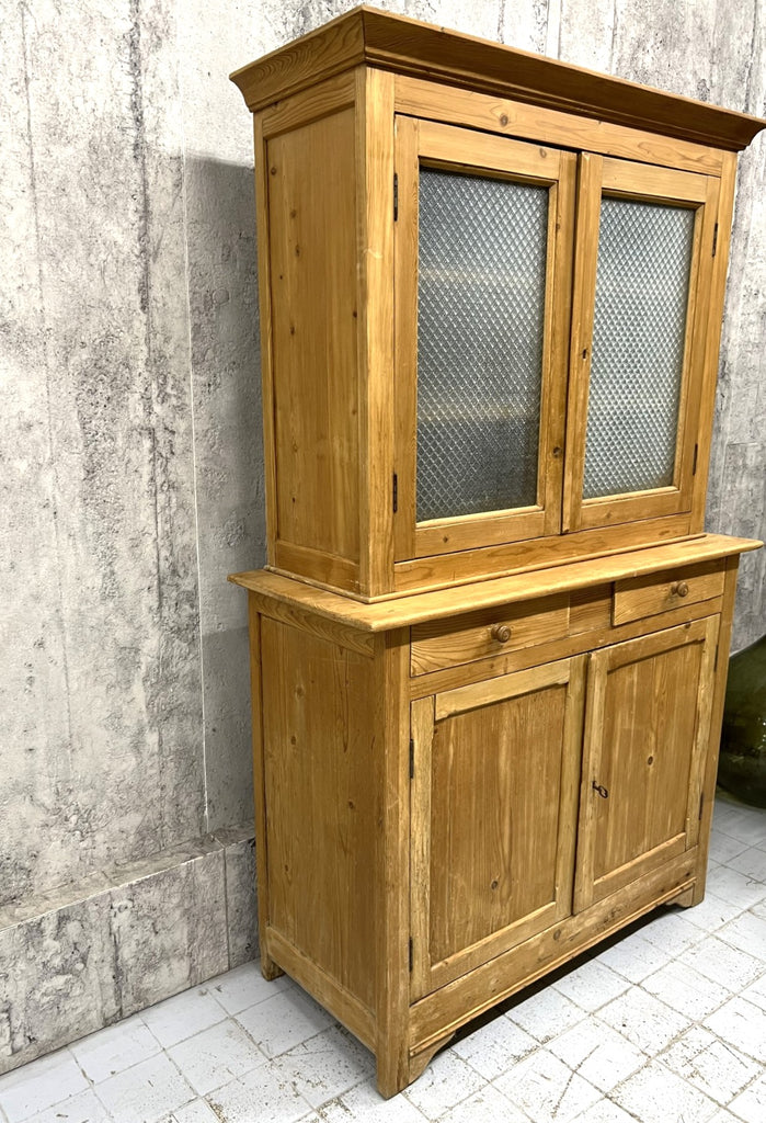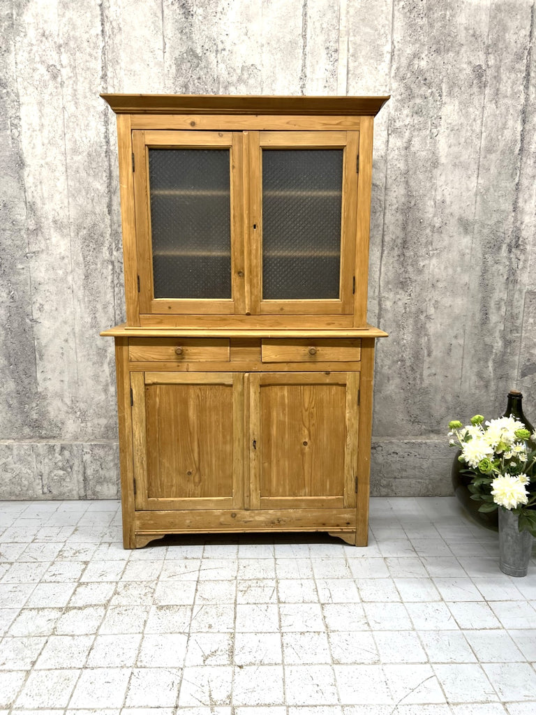 A very traditional pine dresser with cupboard storage in the base and a frosted glazed top section with shelves. It comes in two pieces. The top section is a glass fronted display cabinet opening onto shelves. The bottom section has two doors that also open onto the opportunity of shelves. There are two drawers in the middle. Of no great age, perhaps mid century with marks, bashes and bruises on. Ideal to leave as it is or paint to match your scheme. The shelf from the base is missing but would easily be replaced with some pine cut to the correct size. The key is for decorative purposes, is not original to the lock, but allows the easy opening of the cabinet doors. A useful and characterful addition to a kitchen or pantry.