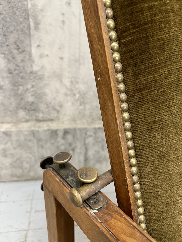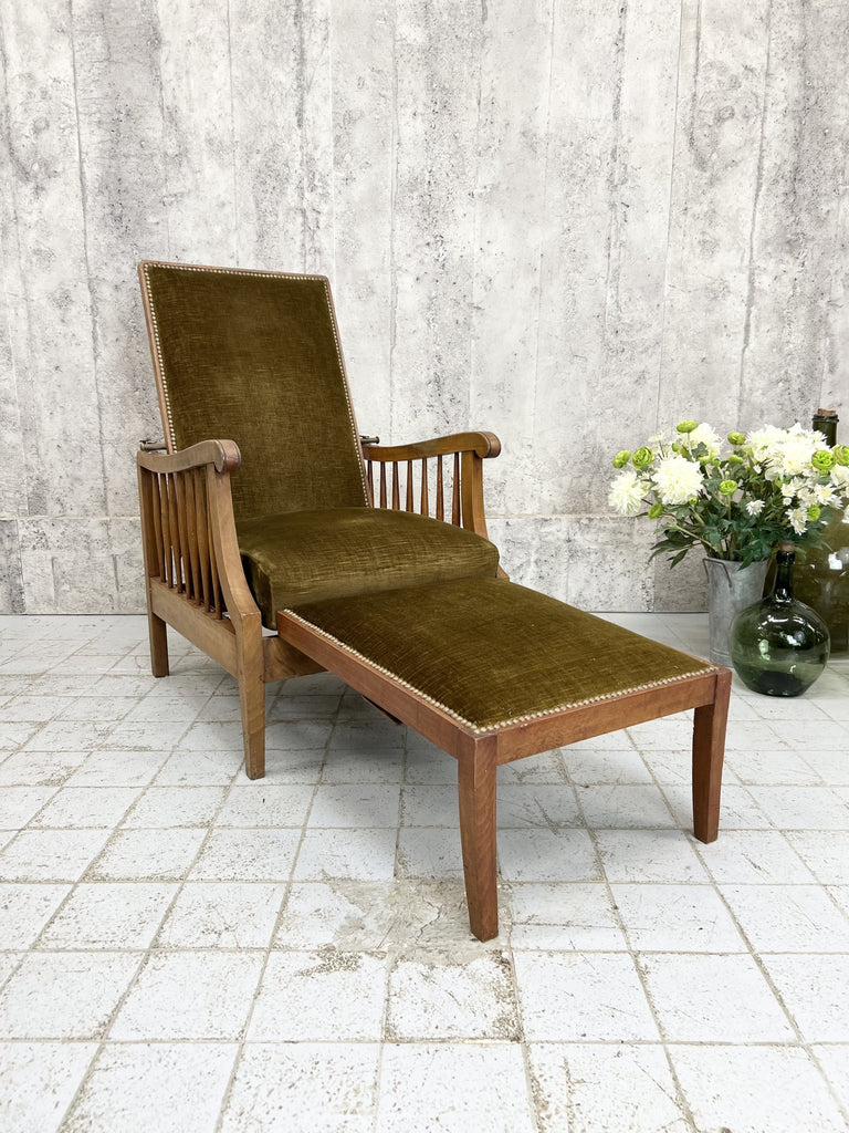 Avery beautiful example of a classic Morris Chair with unusually with an extendable footstool. The oak frame has some pretty shaping to the arms and at the back of the chair. This wonderful example has the mechanism that allows for the footstool to be tucked underneath the seat whilst not in use. Very simple and easy to use. The other lovely detail to the Morris chair is that a metal bar mechanism fixes the position of the reclining back. This chair is upholstered in the original dark gold or Dijon mustard coloured velvet. The chair has the usual bashed and bruises to the frame but all is solid, in excellent working order and with a lovely new fabric, ready to use.