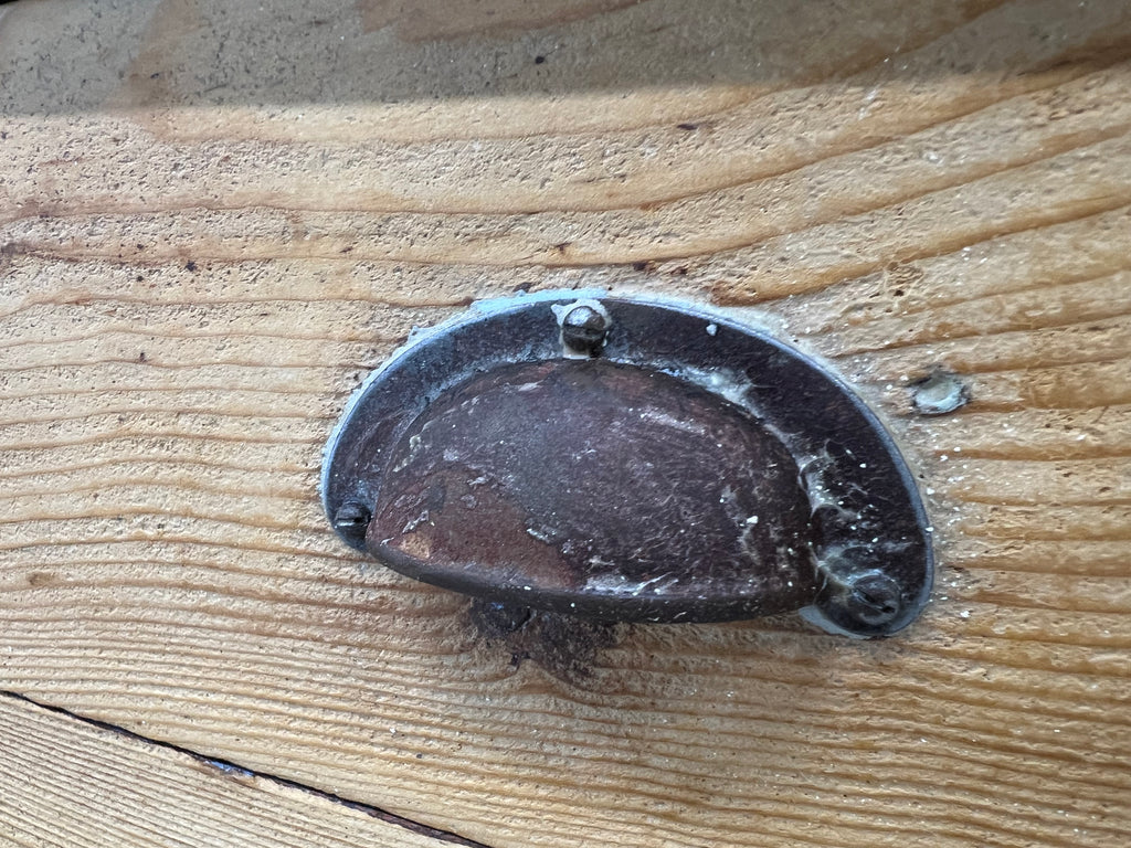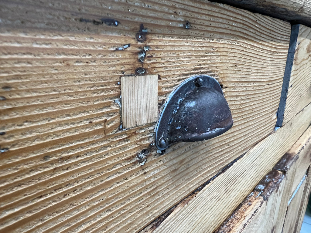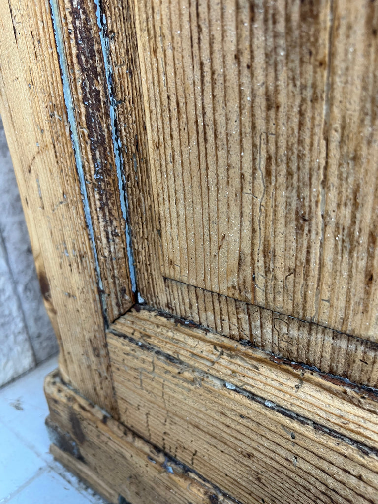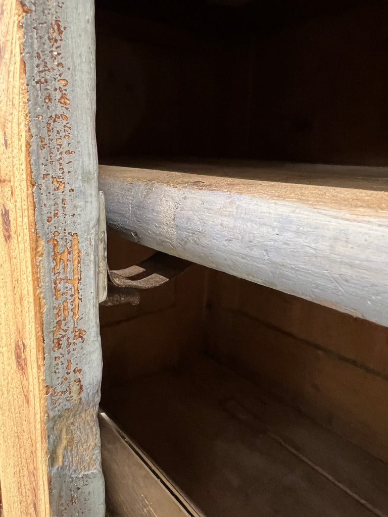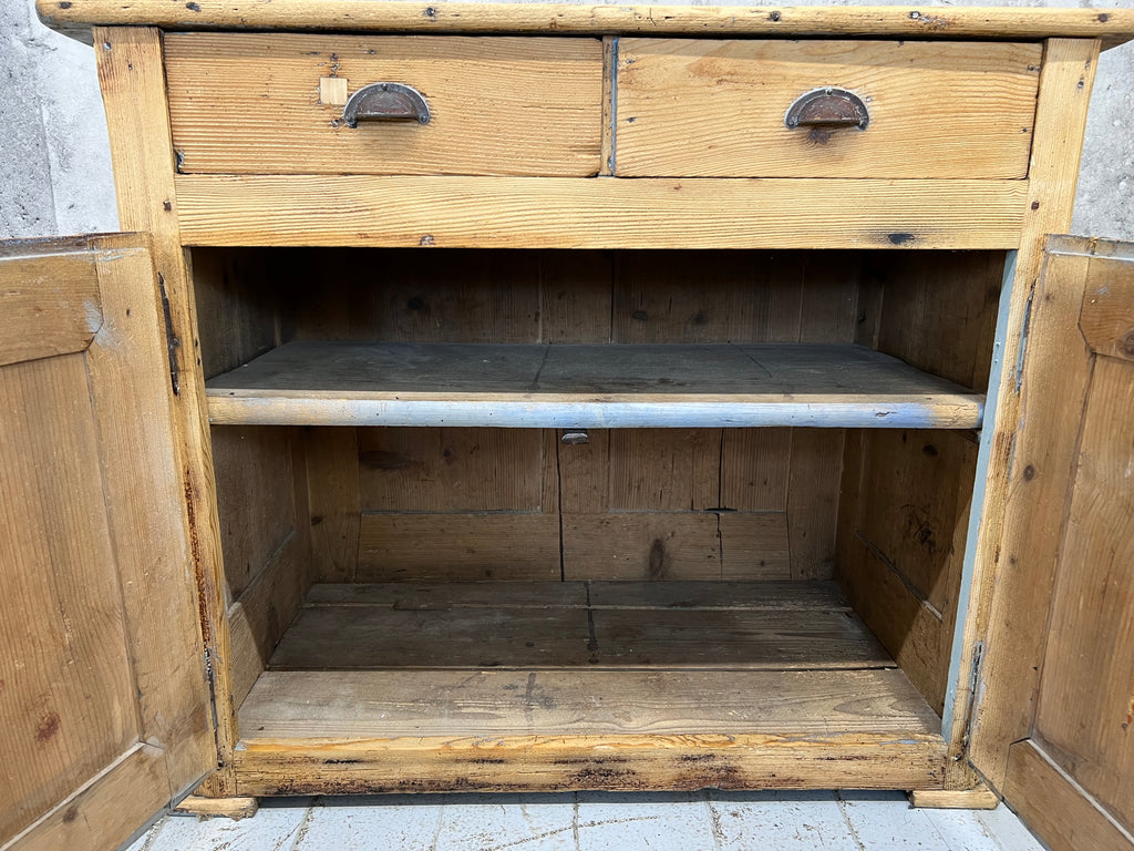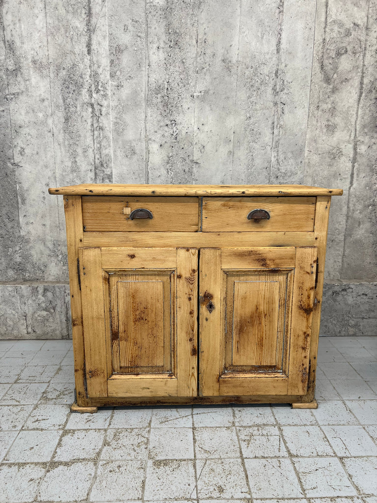 I am not going to pretend this delightful little shop counter is anything but very very rustic. The wood had a life before it became a shop counter, it has marks and texture from that life before... it was then used to create this small, really useful little shop counter that has paneling one side, drawers and a cupboard on the reverse. There is even a blocked up coin hole that allowed coins to fall into the drawer below. This piece was always made to be painted and there is evidence of the previous paint layers. The wood now feels undulated to the touch, but can be used as it is perfectly or it would be an ideal candidate to paint to match your scheme. The original key has been lost over time sadly, but the door stays closed and the second door fixes shut too. A fabulous little characterful piece that would be as ideal in a child's playroom to store toys in, or in a kitchen, hallway, TV stand, sink stand or shop counter. We have priced this piece accordingly.