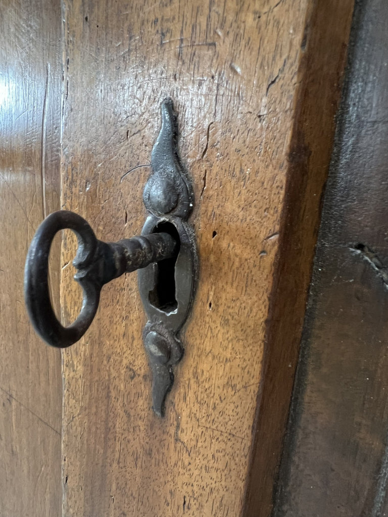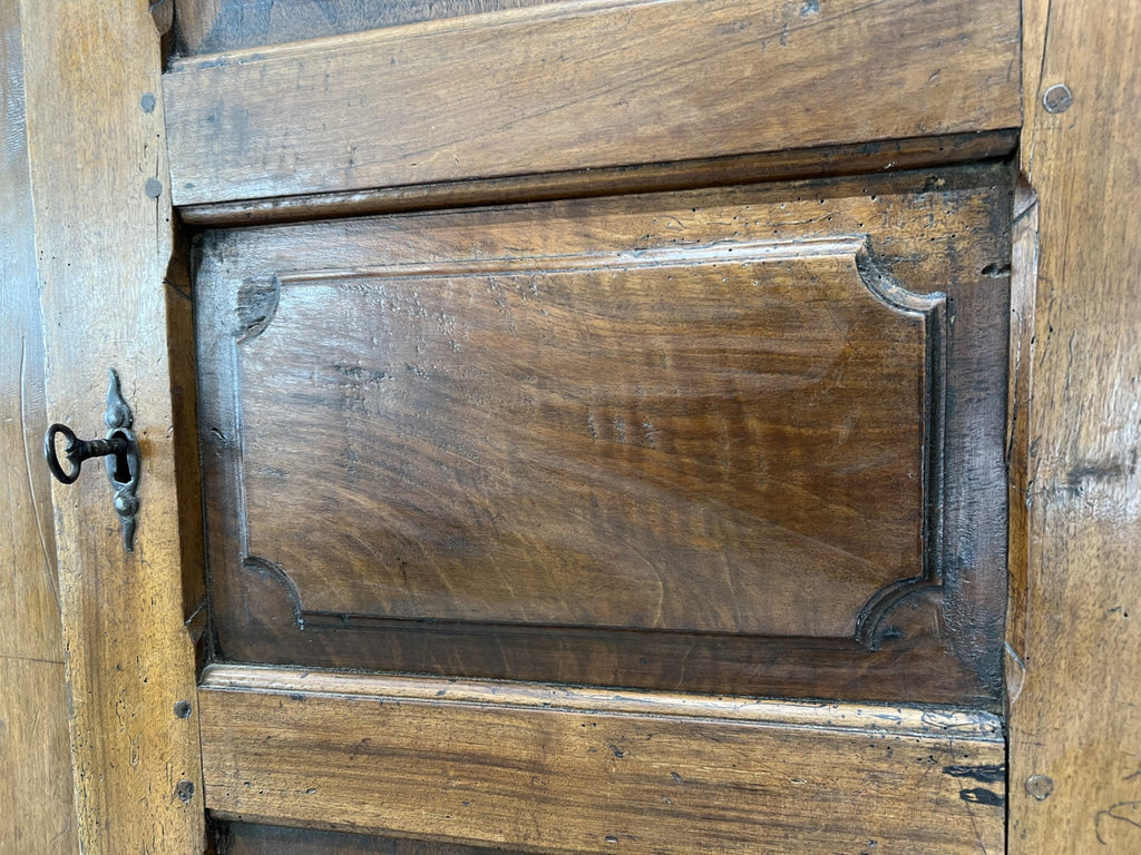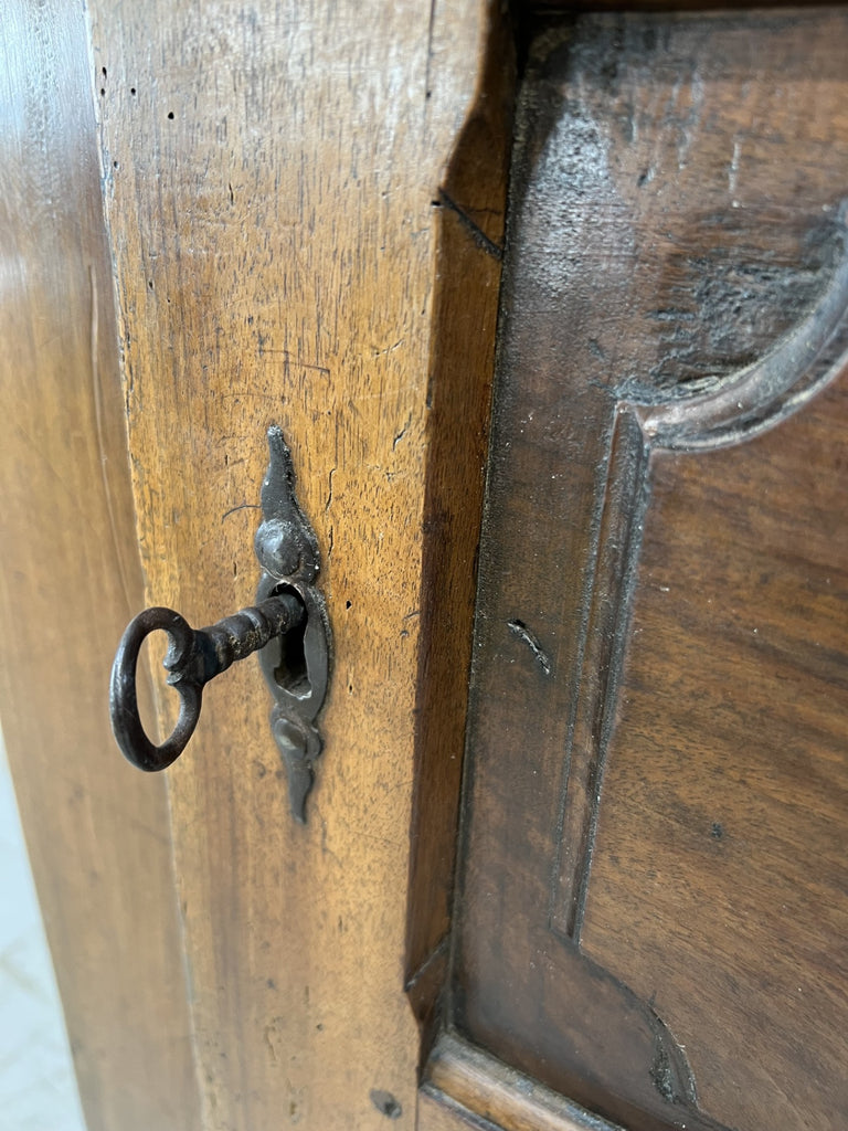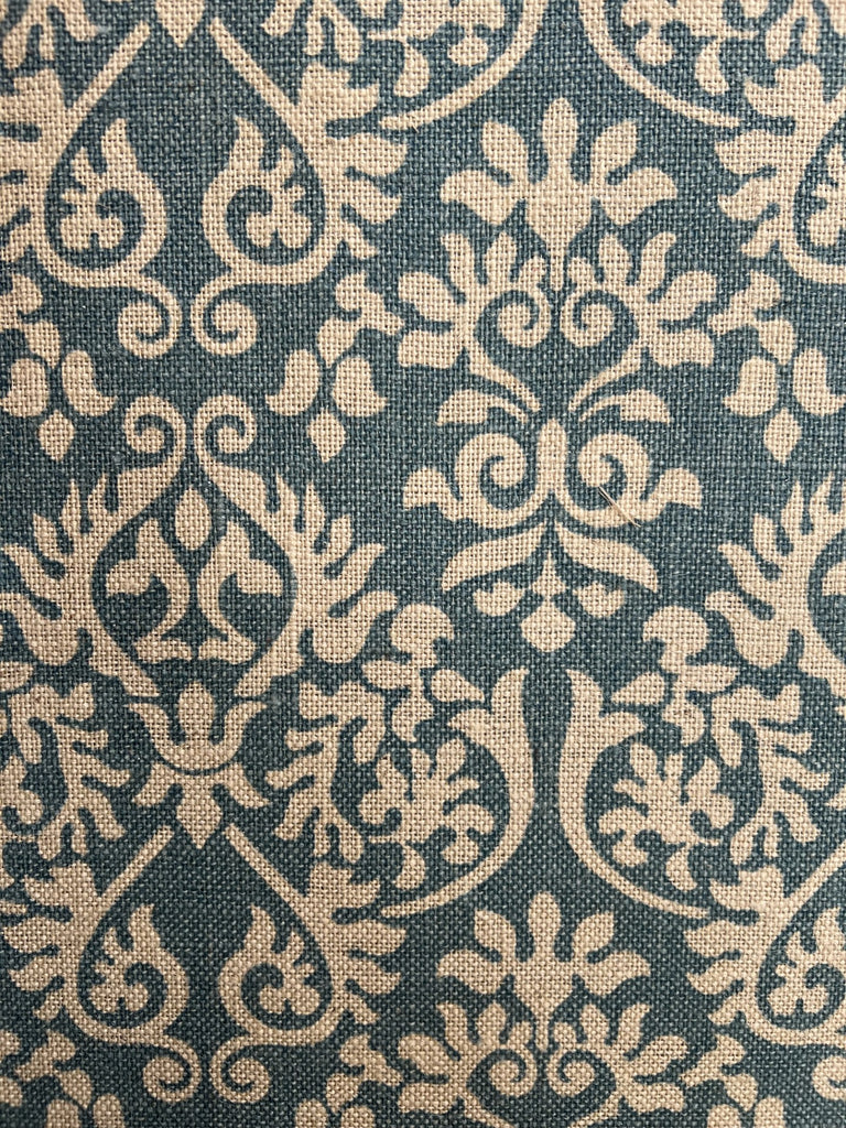 Made from solid oak, this armoire is in wonderful condition. The wood shows extensive wear and tear along with the obvious renovations and ancient wood worm activity, which are all old and we have treated to be doubly sure.  The key is original and the inside is lined with this beautiful teal and oatmeal coloured hessian fabric, which is in wonderful condition throughout.  A fabulous piece, ready to use as it is.