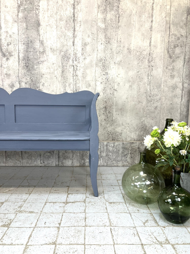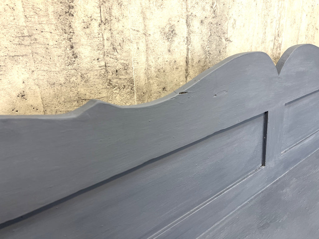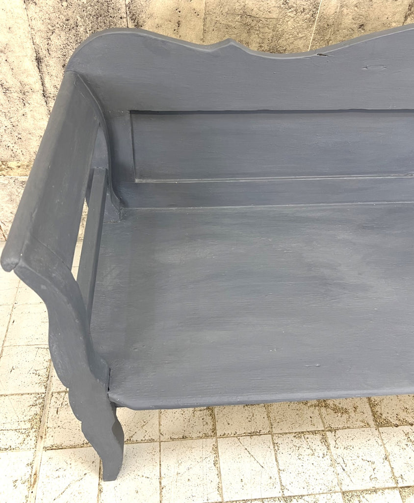 This is a Hungarian style bench used in hallways, kitchens and on terraces. Made from solid wood, this has undergone extensive renovation and has layers of paint currently in this French grey.. which in reality looks a little less blue in the flesh. In good condition. Ready to use as it is.